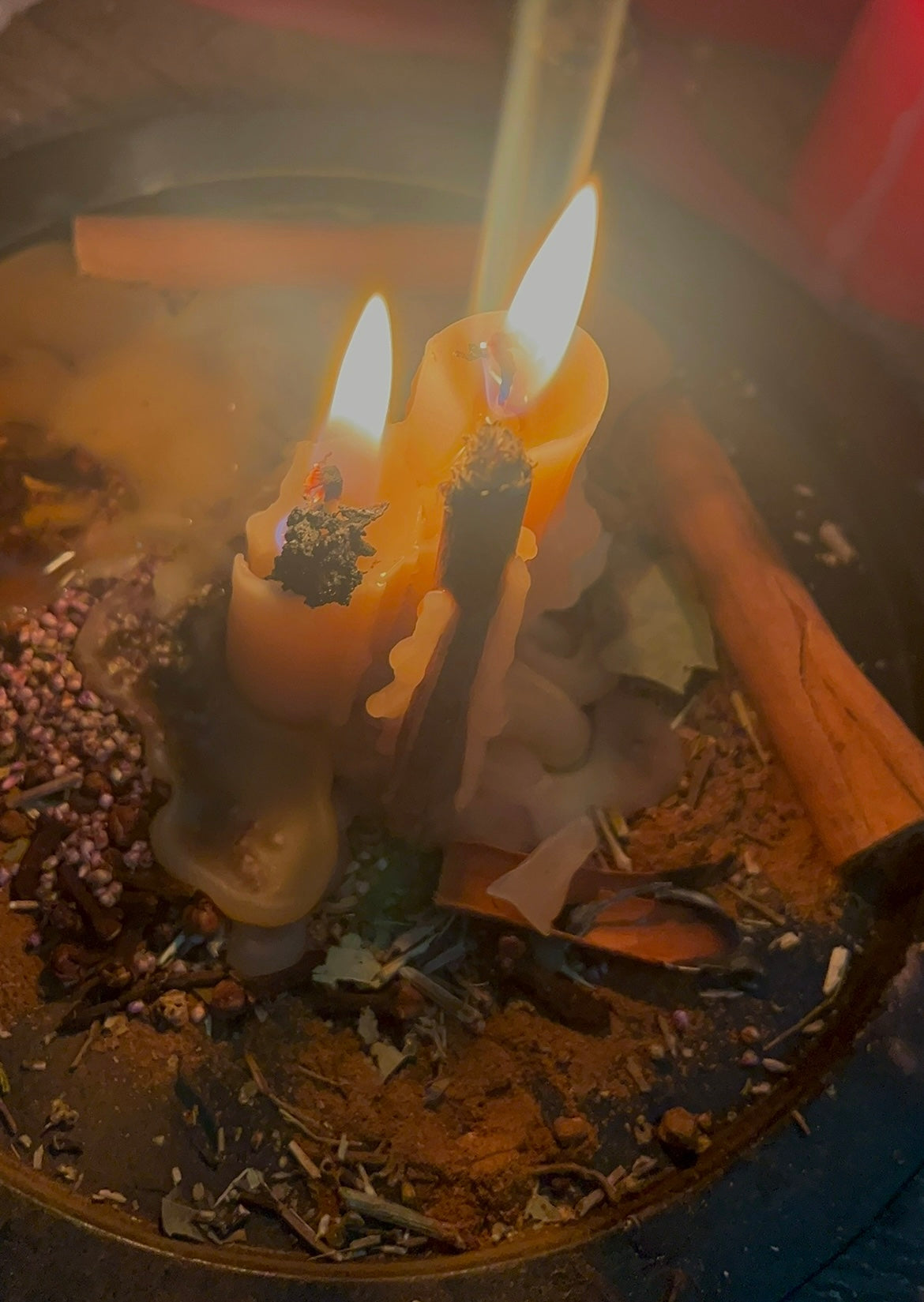 • Dressed candle using solar herbs, success oils, road-opener blends, and gold powders